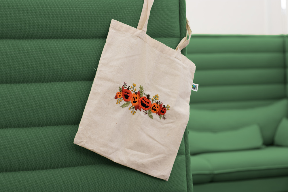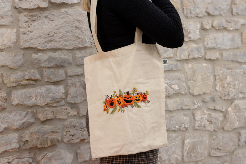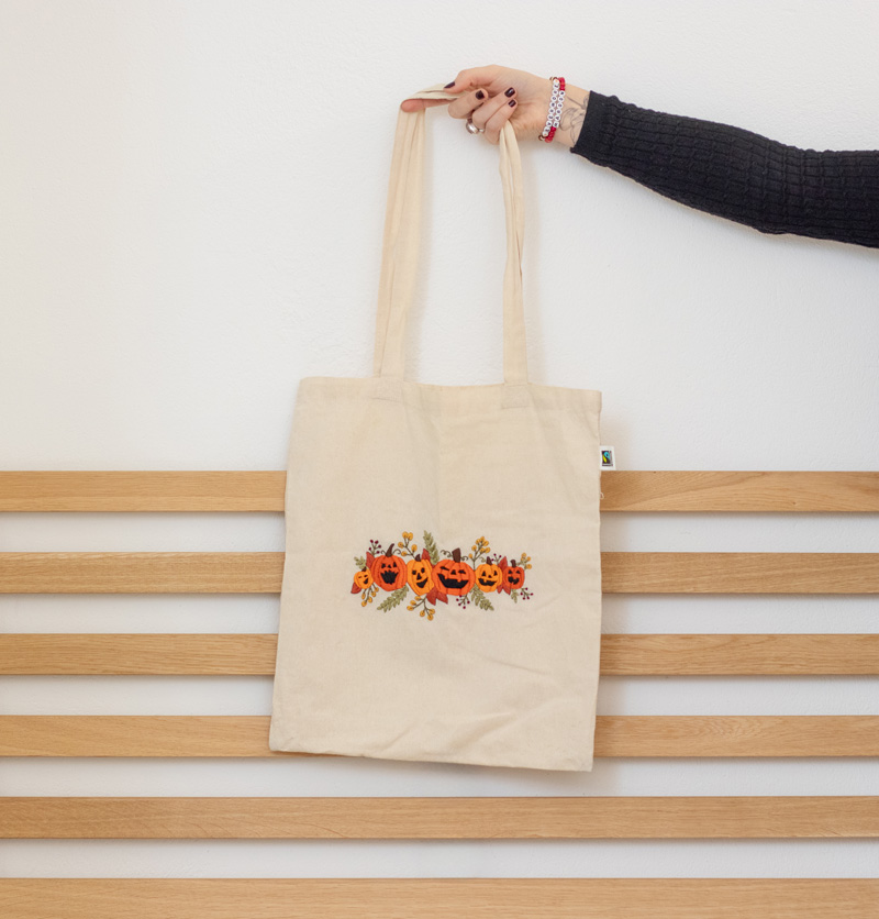 Handbestickter Beutel mit Kürbissen inspiriert von Taylor Swifts Album „evermore“, 100 % Bio-Baumwolle, perfekt für Herbst und Halloween.